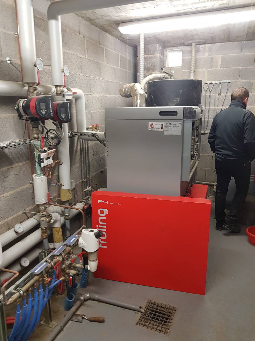 Contrôle et entretien bi-annuel d'une chaudière à granulés de bois Fröhling effectué dans les règles de l'art.